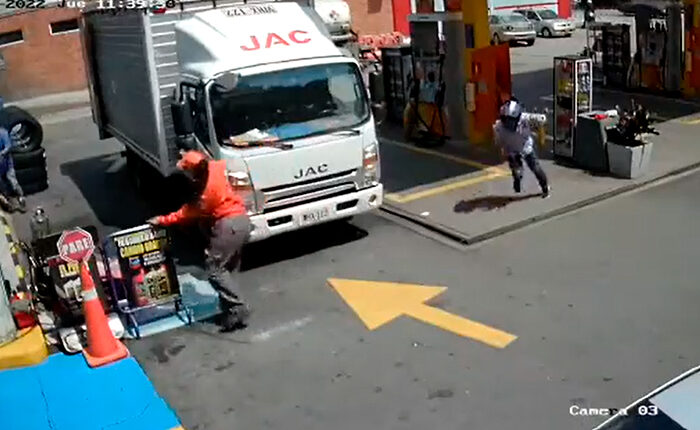 Las imágenes muestran el angustiante momento que vivieron empleados y clientes de la estación de servicio que permanecían en el lugar. Se observa como una de las empleadas intentas resguardarse y junto a ella un cliente se inclina temeroso por su vida.