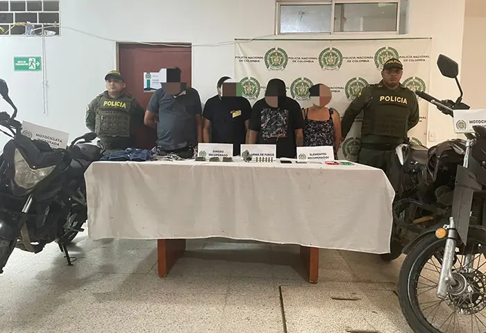 Los capturados fueron identificados como: Annie Joelys Gómez Villa, de Barranquilla 35 años, Javier Stiven Serrano Truyol de Soledad-Atlántico, 32 años, Ramiro Javier Torregrosa Soto, de Soledad 32 años y Julio Cesar Álvarez Sanjuán, de Barranquilla 28 años. Junto a los elementos incautados fueron dejados a disposición de la Fiscalía General de la Nación.