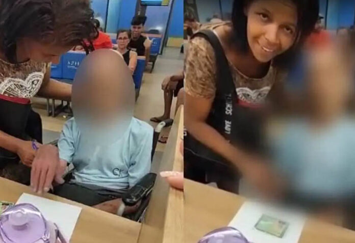 En el clip, que fue grabado por una de las funcionarias de la entidad bancaria, se puede ver cómo la mujer sostiene la cabeza del hombre, que yace sentado en una silla de ruedas, mientras ella intenta poner un bolígrafo en su mano para firmar algunos documentos requeridos por la entidad bancaria para un préstamo de 17.000 reales (12′614.235 pesos colombianos).