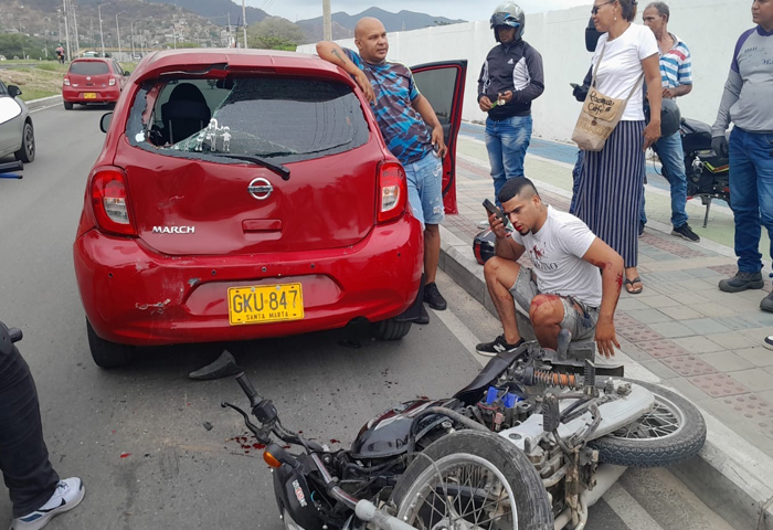 Un hombre sufrió golpes de consideración en medio de un aparatoso accidente después de chocar su motocicleta contra un carro. El incidente ocurrió en la mañana de hoy y tuvo lugar en la Troncal del Caribe, a la altura de la Universidad del Magdalena.
