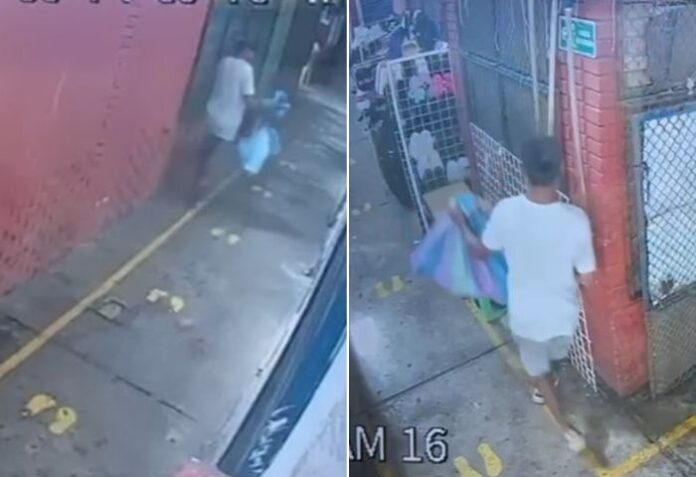 En el video se puede apreciar cómo el sujeto manipula su teléfono, y también analiza el panorama para no ser pillados por los dueños de otros locales y compradores. Al notar que la plaza se encuentra sola, en una rápida acción toma el saco con la mercancía, al parecer zapatos, y se marcha del sitio.