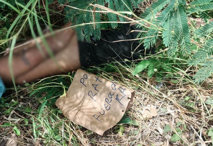 Tras recibir la denuncia, varias unidades de los cuadrantes de vigilancia comunitaria se desplazaron hasta el lugar para verificar la situación. Al llegar, los uniformados encontraron el cuerpo de un hombre sin vida, boca arriba, vistiendo únicamente una pantaloneta de color negro y con un cartel que tenía el mensaje: “Por rata, fuera rata”.